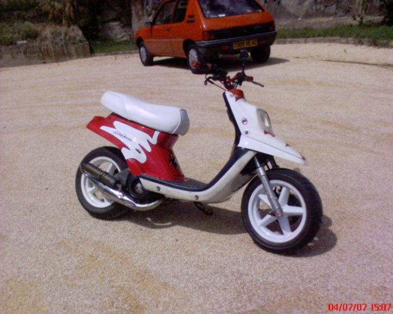 Mon Booster Spirit Redfusion monté en kit HEBO 70cc. Scoot rouge et blanc.