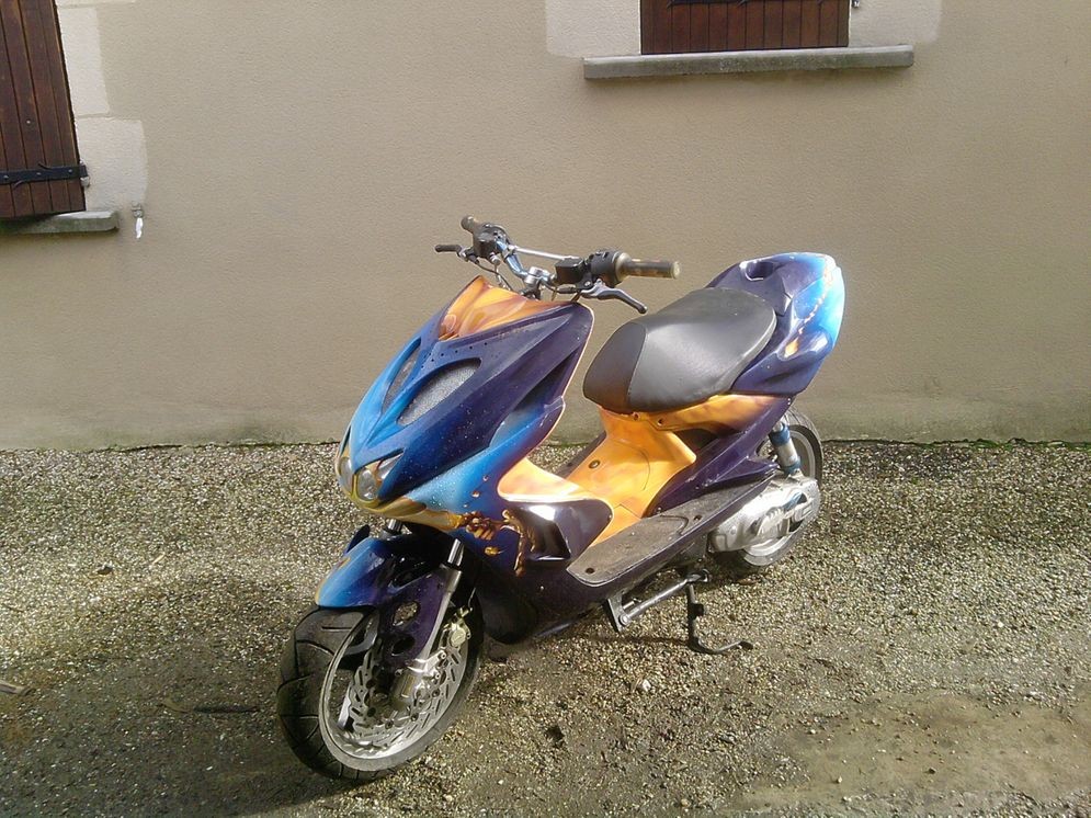 Voici mon Yamaha Nitro Aaerox tuning equipé d'un kit 50 Conti, d'un carburateur 17, pot Bidalot, amortisseur Doppler hsm system à pneumatique et sono.